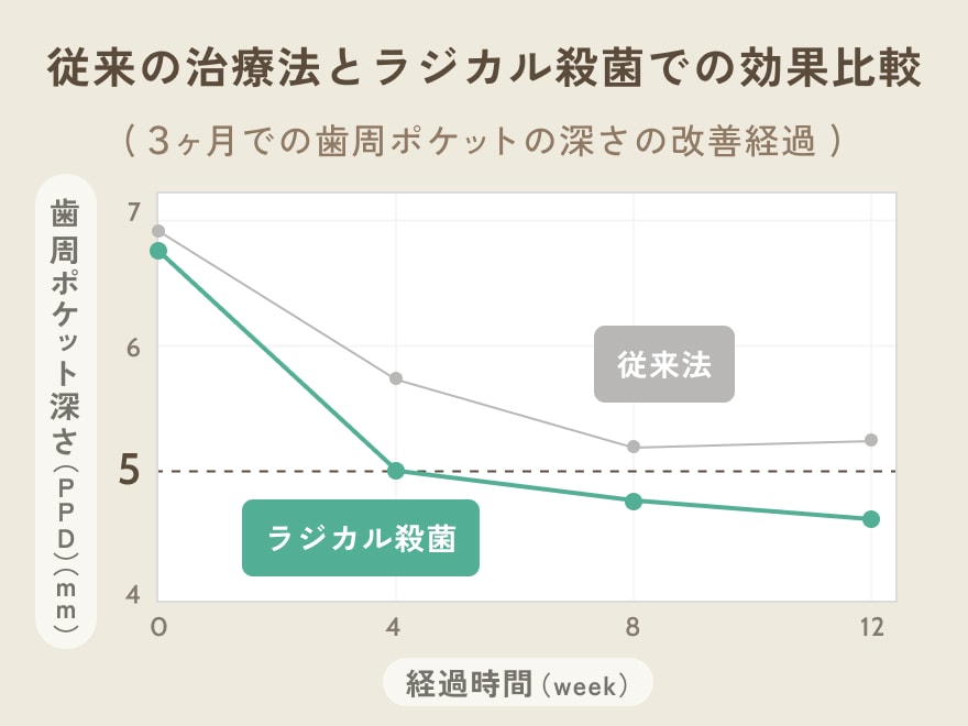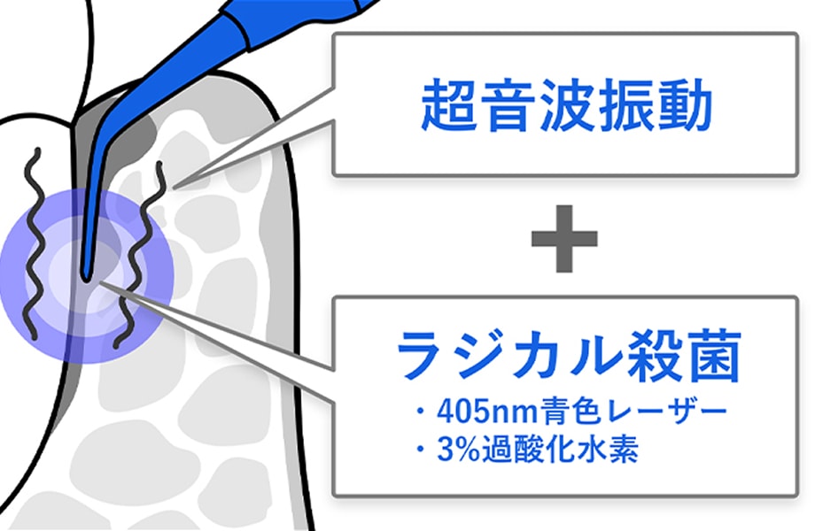 よる殺菌3%の過酸化水素水を歯周ポケットに注入し、青色レーザー(405nm)を照射します。これにより「ラジカル殺菌」が起こり、強力なフリーラジカルが歯周ポケット内の細菌を徹底的に除去します。