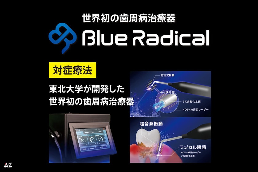 ブルーラジカルは、重度歯周病に対し外科処置不要の新しい治療法として、厚生労働省の医療機器承認を取得しています。医療機器承認は、厚生労働省が治験データや製造環境などを詳しくチェックし、安全性や臨床効果がしっかり確認されたうえで与えられるものです。治験では、従来の治療より歯周病菌を減らし、歯周ポケットを浅くする効果が確認され、世界で初めて“歯周病に有効”と認められた治療器です。